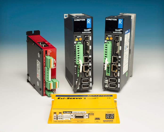 Family of EtherCAT drives: open loop stepper drive from RTA (red coloured unit), closed loop stepper drive from Fastech (yellow coloured unit) and brushless servo amplifiers from Sanyo Denki (two SanMotion units)