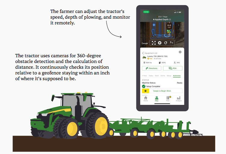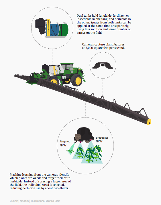 The company plans to start shipping its first fully autonomous tractor later this year. Deere also recently unveiled a crop sprayer aided by machine learning. Thirty-six cameras mounted on a track can sweep up to 2,000 square feet per second to detect which plants are crops and which are weeds, targeting only the weeds for extermination.