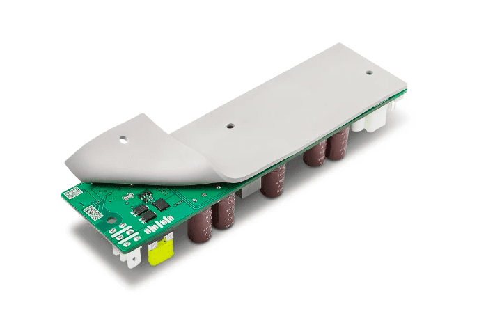 For the optimal thermal connection of the power components on the underside of the circuit board, a suitable thermal pad (gap filler pad) is already included in the scope of delivery of the DC161W. Due to the very good thermal management, the warming of the DC161W is reduced to a minimum and thus makes maintenance-free systems without rotating fans possible.
