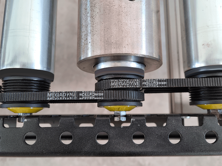 The installation is fast and easy. Rollpower™ is able to run even 50 rollers together. There is no need to use idlers or tensioners. No slippage occurs because of the precision of rib design and accumulated sidewall friction.