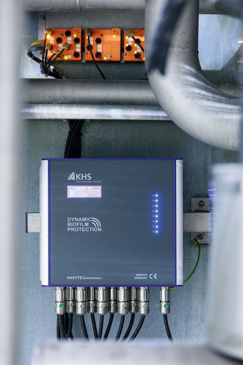 This time the technology isn’t new, however, but a procedure that’s been in use for many years in a completely different sector, namely shipbuilding, and is now being applied to the beverage industry. KHS HASYTEC Dynamic Biofilm Protection is a simple plug-and-produce product where ultrasonic transducers cause the liquid in certain components of the machine to gently vibrate. The system is currently available for both bottle washing machines and pasteurizers – whether for new machines or as a conversion for existing systems.