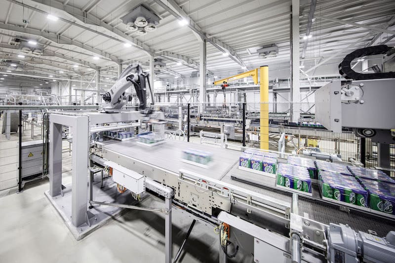 With the help of robots, the KHS Innopal PB palletizer and KHS Innopal PTR pallet conveyor form layers automatically, stack products on the pallet and feed these to the logistics area. source: Frank Reinhold