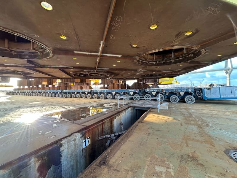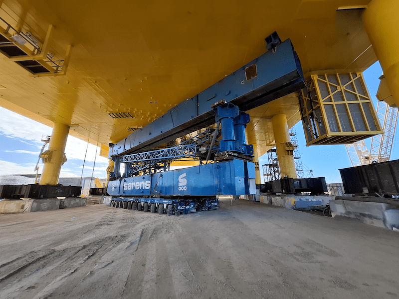 The Sarens team, operating on behalf of Dragados Offshore, encountered a challenging scenario due to three weeks of heavy rains off the coast of Cadiz, which made the assembly of the transport stools particularly difficult. Similarly, the task of removal of 2000T of stools from beneath the topside was also a major challenge, as the structure had numerous protruding parts that required a specially careful maneuvering.