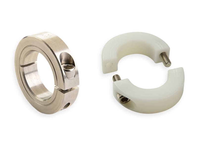 Shaft collars made from 303 and 316 stainless steel utilize hardware of like material for consistent corrosion resistance and to meet regulatory standards. Plastic shaft collars can be used as a cost-effective alternative to stainless steel at the expense of performance. They are supplied with stainless steel hardware for corrosion resistance. Ruland also offers anodized aluminium shaft collars with stainless steel hardware for areas of the system where stainless steel or plastic is not required. Shaft collars are manufactured in bore sizes from 3 mm to 150 mm.