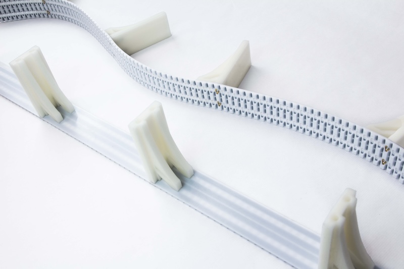 In this type of application, belts with a custom design become an effective solution, as they allow the incorporation of elements adapted to the transported product. A clear example is the development of a belt equipped with custom cleats under the Ydins brand, specifically designed for the upward transport of tubes, significantly improving the grip and safety of the system.