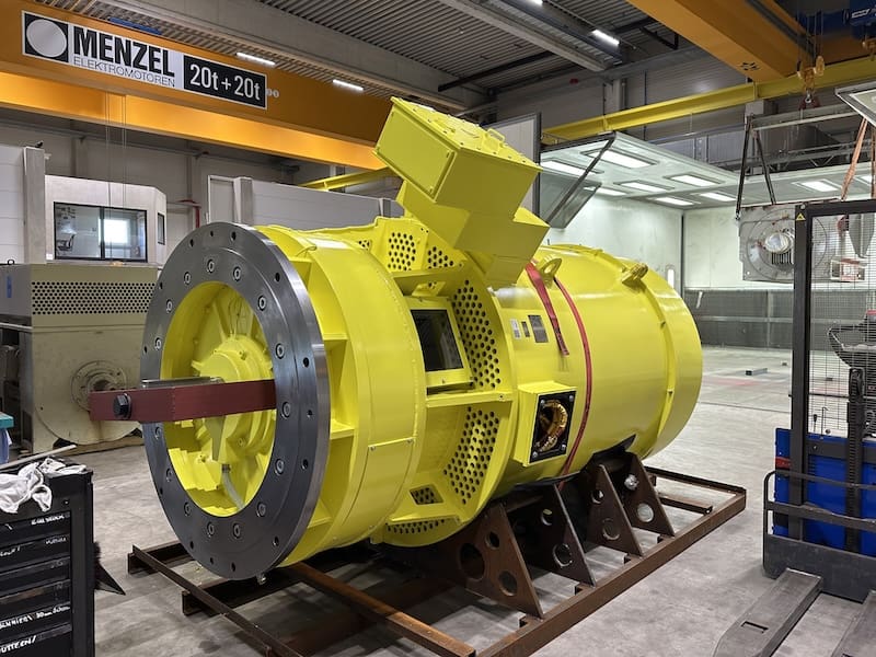The customer requested Menzel to fit the brush-lifting device on the drive side. The motor manufacturer also implemented this uncommon design expertly and within a manageable budget, including various additional works such as fabricating extension rings. Moreover, the family business manufactured a customized motor shaft and terminal boxes. Before shipping, Menzel thoroughly tested the pump motor, making use of the latest addition to its test field, a 3-MW right-angle gearbox that allows load tests in a vertical position. An independent test technician appointed by the customer supervised the load test. The bespoke motor is rated for 1150 kW, 6300 V, 14841 Nm and 740 rpm.